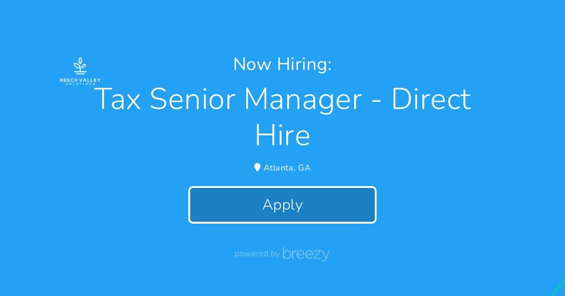 Beech Valley Solutions is assisting our client, a top 100 CPA firm, with their search for a Tax Senior Manager in the following locations: Atlanta, Nashville (Brentwood) and Tampa. These are full-time, direct hire opportunities with competitive salary and benefits.